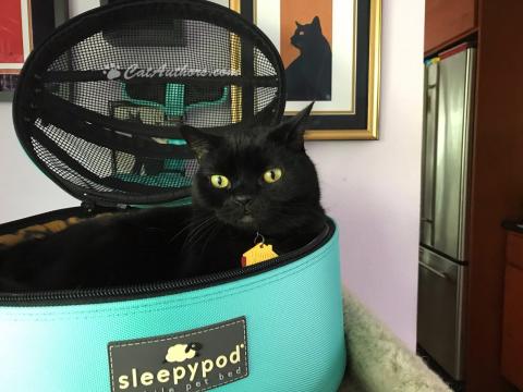 This Sleepypod thing is totally cool. This is Spirit's. I want my own! Sleepypod conducts safety crash tests on their carriers. And, when we ride, we buckle up. Check out their crash test videos & info on their Safety Test Program. Seatbelt straps allow the Sleepypod Mini to be secured in a CAR SEAT. The Sleepypod Medium can be attached to our car's SEAT BELTS. Our carry handle is padded as is the adjustable shoulder strap. The zipper pulls are ergonomic. The Mini fits beneath a wide range of airline seats. Don't want to fly but just sayin.'
