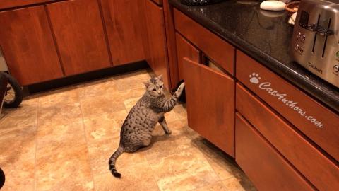 Yep. You better come check this out! Guess who's in our food cabinet. It's the one, the only--the only bear in this whole house--probably in this whole neighborhood, maybe in this whole town--it's INKEE-BEAR! If he put holes in our brand new yummy bag of treats, I'll kill him! I haven't even had one of those treats yet. I'm the youngest, I should be the first to get a treat. Know what I mean? The youngest is always the first!