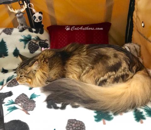 Yikes. This sorta' big guy is a Maine Coon. Is he bigger than me? Dunno.' They are supposed to be a super breed. They have a thick coat with a big tail to wrap around themselves to keep warm in winter. Are they happy in say, Southern CA? Yep. Meowmuh's friend, Lynne, had a Maine Coon named Merlin and he was very happy -- and handsome. Am I jealous? Nope. Meowmuh always says how handsome I am.