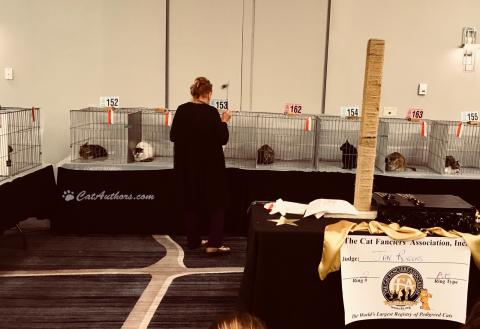 At cat shows, they judge you by I don't know what. They fur shure judge by breed. Meowmuh said she didn't see any Egyptian Maus or Scottish Folds there so she watched the judging for 'House Cats' or the 'mixed' or 'no-breed' cats. Meowmuh was rooting for a little kitten but he only came in 10th out of some 34 entries. She said she liked the kitten because it looked and acted like me. Reckon that's a good thing.