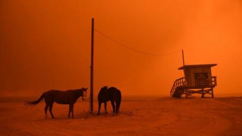 The Woolsey Fire in the background illuminates two horses waiting further evacuation on the beach in Malibu. Many homes in Malibu were burned because the fire moved so fast over the mountains to the ocean. Some people fled in their boats. The Pacific Coast Highway was jammed with evacuees heading into Santa Monica. This Santa Ana event whipped major, historically destructive fires through drought stricken areas AT THE SAME TIME throughout Northern & Southern CA. This is a Getty pic.