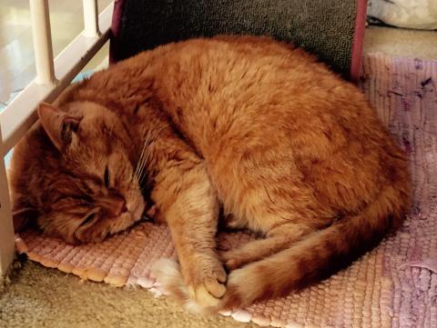 I love to nap here -- on the landing on the stairs -- on my fav orange carpet. I just got through playing with my new little brother, Spirit. He is enough to wear out any 2 or 4 legged critter! There's a time to play & a time to nap. This is my time to nap. Don't ask me what Spirit is doing. Probably bugging Inkee-Bear or Sophee. Do I look like I care?