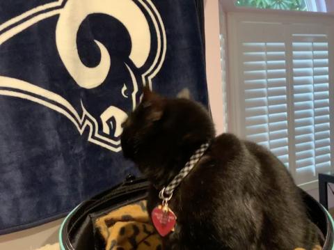 That's a ram? What big ears you have, Mr. Ram. Those are horns? They're hard? So when they ram someone or something it really hurts? Yikes. Then they should win. They're playing the Patriots? Isn't that an automated surface-to-air missle? Our cat-tionary says the Patriots detect & intercept incoming missles/aircraft & probably footballs! So, the Patriots will try to intercept those footballs. But the Rams will ram 'em & get the ball. We live in Los Angeles so we're cat-fans for the Rams. GO RAMS!