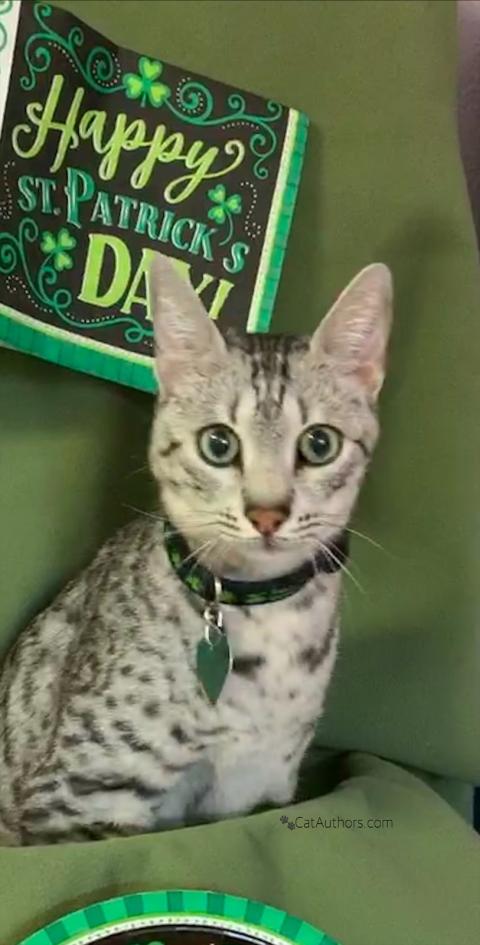 They do what on Saint Patrick's Day? They drink green beer? They turn a river green? Nah -- & if you believe that - well, you get my drift. Everyone wears green? Why? So they don't get pinched? Yikes. Well, I won't get pinched. I have green eyes -- all us Maus have green eyes. Oh, my new collar has green on it -- as a matter of fact, it has shamrocks on it. So, if what Inkee-Bear says is true --that shamrocks bring luck -- then I'm one lucky feline!