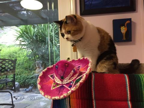 SOPHEE: I told you last year -- my ears hate hats. What kinda' hat is this anyway? HER HOOMAN: I'm not asking you to wear it; just pose with it. To answer your question, 'Sombrero' is Spanish for 'shadower.' It is a wide-brimmed hat from Mexico used to shield from the sun. The brim is broad enough to cast a shadow over the head, neck & shoulders of the wearer & slightly upturned at the edge. Usually there is a chin string to hold it in place. It is worn by 'traditional horsemen' of Mexico.