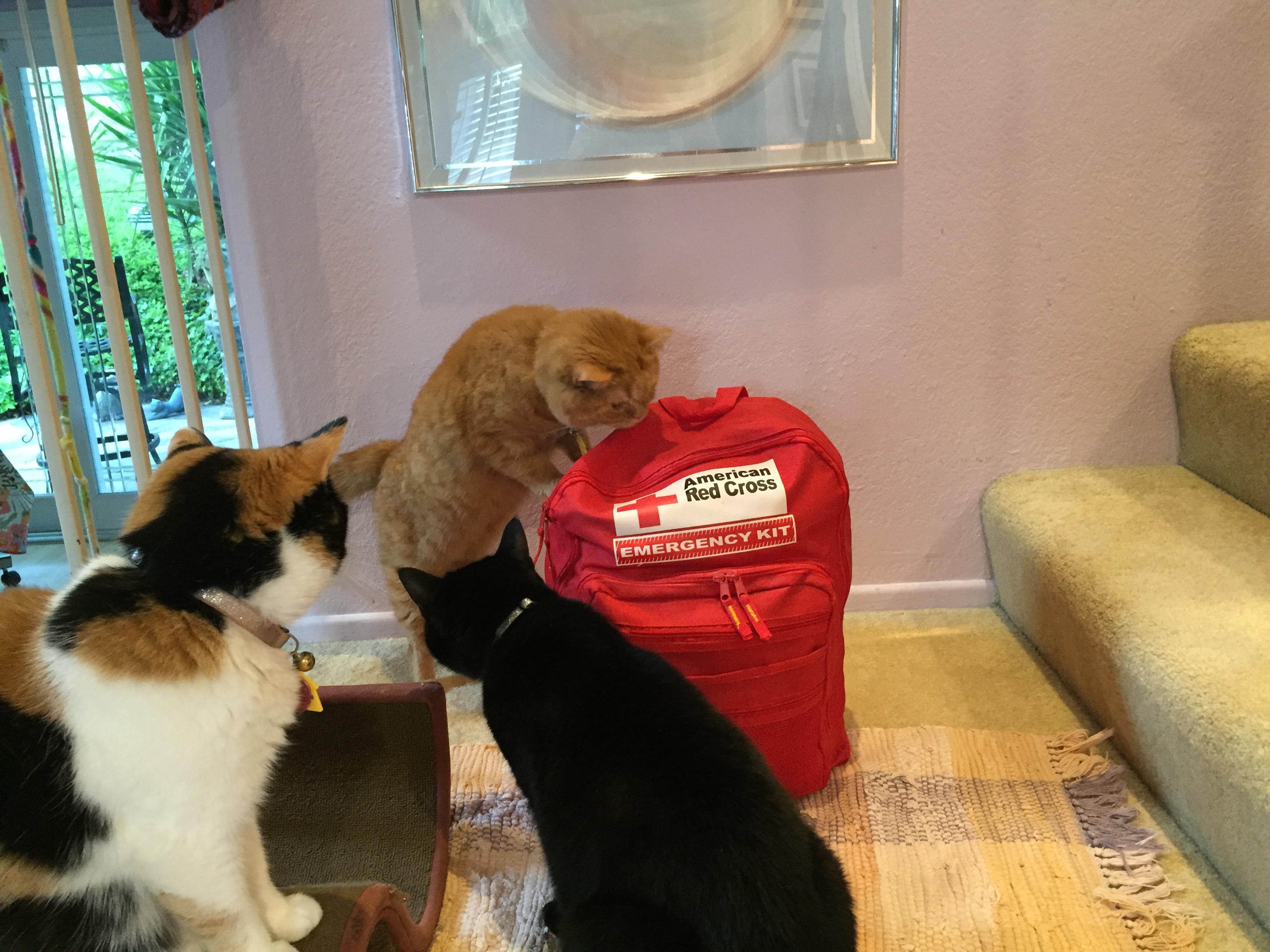 You caught us investigating our Emergency Disaster & First Aid Kit. Our hooman took a Pet First Aid class from Denise Fleck @ petsafetycrusader.com. You can see her classes on your computer. So, if we get hurt in a disaster, we will be taken care of. We have never been in an earthquake but our hooman was in a really bad one. Hoomans & animals were hurt. We weren't around then - it was a long time ago but our hooman has never forgotten it. She says she hopes there won't be another but she is prepared.