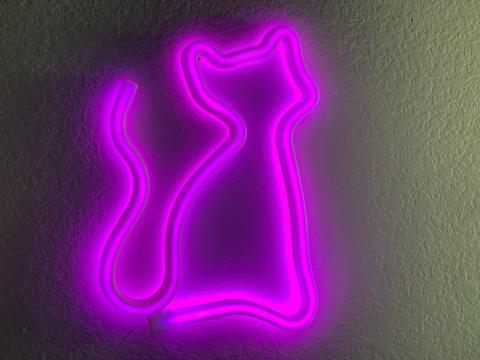 Check out the new neon Cat wall art from our Cat Lady Box. This is Mom’s fav color. But it’s a wee bit bleary. Sorry ‘bout that. We don’t take pics of neon signs very often so maybe our camera doesn’t like neon. But we do. A purple neon cat is pretty cool don’t you think?