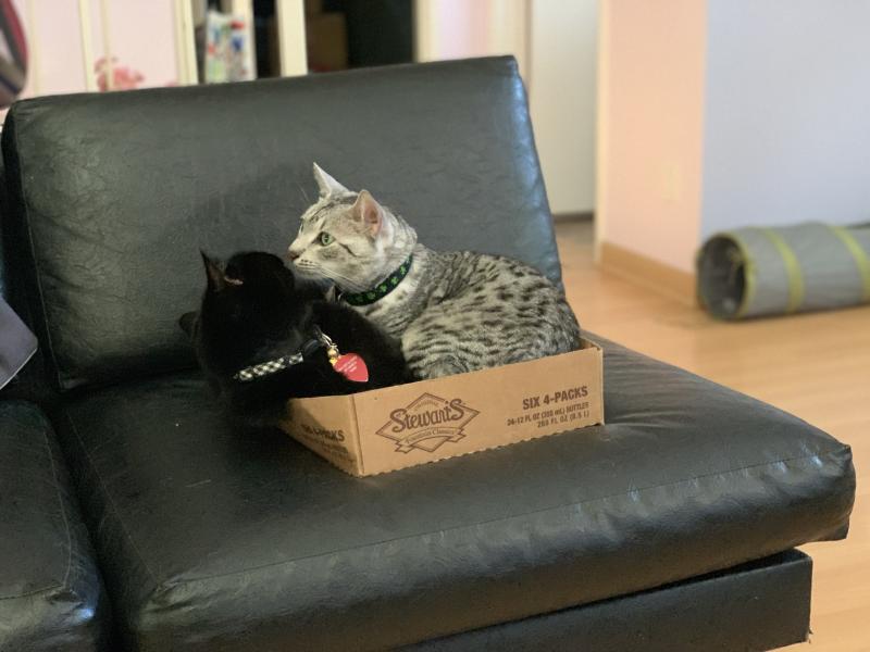 GRACEE: Guess who's got the box now. Poor Inkee-Bear. He loves peace and Spirit's middle name is clearly NOT peace. Inkee-Bear's pain is my gain if you know what I mean. Stay home, stay safe and remember, if you do go out, arm yourself -- with not just your mask but gloves for your paws too. Especially if you're gonna be swatting anyone, I mean anything.