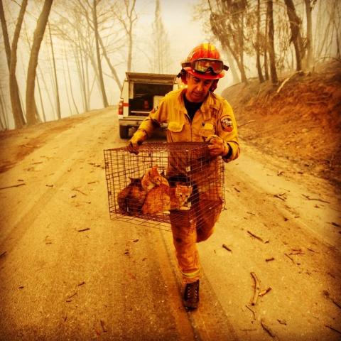 Fire Captain Millosovich carried a cage of kittens out of harms way. He told AP Photgrapher Noah Berger that the cage fell from the bed of a pick-up truck as an evacuee drove to safety during the Paradise Fire in Northern CA in 2018.  A few of the kittens are orange like me. I'm not only the oldest cat in our house but I'm the only ORANGE cat in our house.