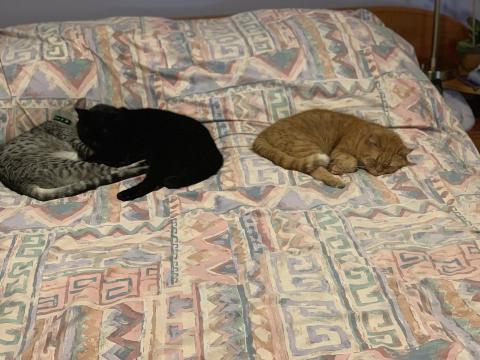 Our hooman's been sitting in front of that screen for a long, long time. It's very late. Maybe she's writing about us. We help her as much as we can -- including not stepping on the keys in front of the screen. She tells us: "Be careful, don't step on the keys." I never do but some of my sibs -- well, sigh. It's been dark out for a long time now. So, we're waiting for her to come to bed.
