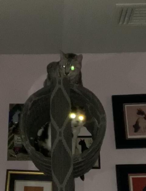 Here's another pic of us in the dark. Our hooman didn't edit this pic or make it lighter. My eyes are super bright cause I'm looking directly into the camera's flash. The shine comes from that reflective layer at the back of my eyes called the 'tapetum lucidum." Spirit sits above me but he's not looking so directly into the flash of the camera.