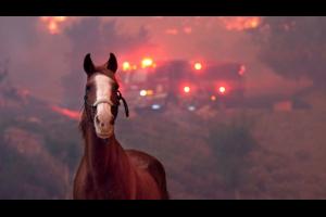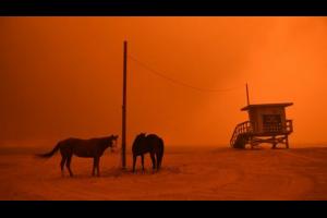 The Woolsey Fire in the background illuminates two horses waiting further evacuation on the beach in Malibu. Many homes in Malibu were burned because the fire moved so fast over the mountains to the ocean. Some people fled in their boats. The Pacific Coast Highway was jammed with evacuees heading into Santa Monica. This Santa Ana event whipped major, historically destructive fires through drought stricken areas AT THE SAME TIME throughout Northern & Southern CA. This is a Getty pic.