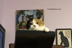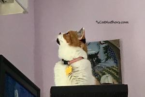 Am I actin' & lookin' sweet & innocent enough? Meowmuh still hasn't noticed the crooked picture. You know, we have dozens of earthquakes in Los Angeles. None recently? None today? Well, she won't know. She's busy & tired. I'm just gonna' kick-it up here. I'm on the top step of the cat tree now. My ears almost brush the ceiling. Well, not really. I'm not a liar. I just like to tell 'stories' & do 'things' that none of the other cats even think about saying or doing! Meowmuh says the things I say & do are highly creative. I'm highly certain she's right.