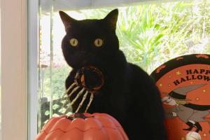 Oh, now I get it. So,let me get this straight. Halloween's about scary things like ghosts -- skeletons -- flying, cackling witches -- & something else. Gimme' a minute. I'll think of it. You know, what big & little hoomans shout when you open your door on Halloween night. "Trick & Tweet." No, that's not it. "Trick & Treat!" That's what they say. TREATS!! Where are my treats?