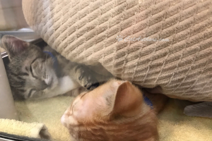Meet two precious kittens at the Pasadena Humane Society's 'Neely Center for Cats.' These two little ones are in the midst of a serious kitten-nap. They must really be tired because there were a lot of people milling around looking to adopt. NOTICE: They are sleeping IN their cushy little bed. The kittens in the next pic found their own, unique place to nap.