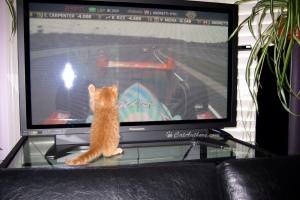 Meowmuh is all excited 'bout somethin' on TV. .Somethin' about races. Maybe the hooman race. No? A car race? What's that? She says it looks like I'm 'drivin' my cat tree with my arm out the 'window.' Don't know what 'drivin' means. Then she says I'm too young to drive. As you can see, I'm still a baby in this pic. But watch me get 'into' this car race.