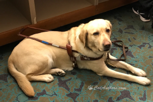 This is an 'elder' guide dog at an ALOUD presentation at the Los Angeles Central Library. Meowmuh went with our auntie, Laurel. The presenter was Stephen Kuusisto, also known as the Blind Poet. He discussed passages in his book about the limits on his life prior to deciding to apply for a guide dog. Of compelling interest was the saga of his sojourn in & through Guide Dog School. The training was extensive &, for the first time, he met hoomans like himself--blind hoomans.