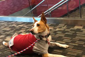 This guy is big. He's a Golden Doodle, whatever that is. But, most important, he's a Certified Therapy Dog. He graduated from the year long course. Now, as soon as his vest is on, he knows he is going to 'work.' He'll become something other than 'just a dog.' He was trained to put his chin & paw on the patients he visits. He works in an assisted living home & is going to branch out to hospices. When his vest comes off, he is all dog -- jumping between the beds in the room, tearing all the towels off the racks. We think he deserves as much 'I'm-gonna'-be-a-dog' time as he wants.