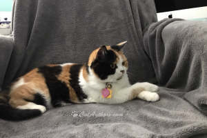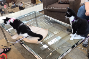 These are two siblings.They're multi-colored like me but they only have two colors. I have THREE! The sister on the left knows how to 'bump-paw'. She does a high-five to her hooman's fist. Very cool. Her hooman says she's real smart. NEWS FLASH: so are we, ALL of us. Well, maybe me more than the others. Calicos are supposed to be smarter, everyone knows that. Right?