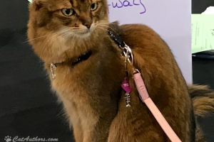 Meowmuh went to the BlogPaws Conference in Kansas City, Missouri in April. She met two-legged & four-legged critters.This is Sabina, a four-legged feline critter. She is sort of orange, sort of like me. I'm all orange, some people say I'm red. But we were left Meowmuhless for FOUR DAYS! Fortunately, our Auntie Sharon took care of us. She fed us & talked to us & FINALLY, Meowmuh came home.