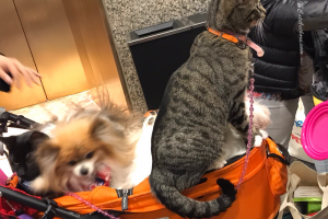 My turn to talk. My gabby sibs are doin' all the talkin' today. We started these pics showing the cat 'Sabina' & we’re going to end showing the 'Stroller Cats & Dog'. Did you notice? The word ‘cats’ is plural. Yes, there are two cats in this pic. The handsome one sitting on the edge of the stroller (looks like me) was a rescue kitten last year. To the far left (on the other side of the ‘floofy’ dog) is a little black kitten... just rescued.