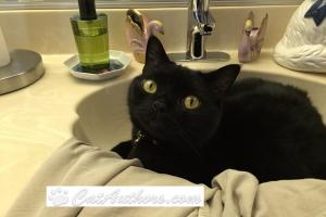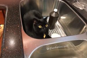 I love sinks! I'm upstairs, in the round bathroom sink. What's really fun is unscrewing the top to the drain. Then push it onto the counter & out onto the floor. Meowmuh didn't think a cat could do it but one day I showed her. None of our sinks or tubs have drain tops now. I guess she put them all in a drawer.