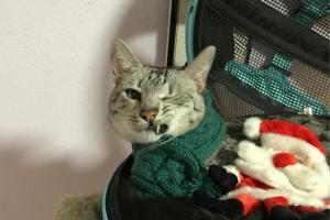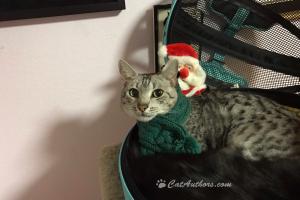 First I have to wear this dumb scarf, Inkee says I haven't been good, early this morning hoomans made loud noises power-washing our house & windows cause of the soot from the fire, so I ate breakfast too fast & threw up & now my whiskers got caught on my sweater. I hope your day is going better. Bah, humbug.