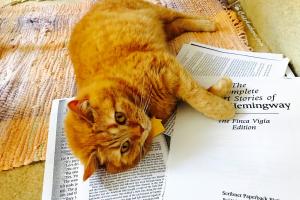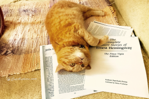 Yes I CAN! I can "absorb" these stories while I'm upside down. They're handouts from Marion Bright's writing class in Pasadena. I found 'em on the stair landing, & rearranged 'em into a comfy nest for catnapping. See Hemingway's story? He loved cats, particularly polydactyl cats. Click on "Hemingway's 6-Toed Cats" news article to learn more.