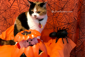 I gotta' take this Hallow-weird investigation into my own paws. The pun-kin's harmless. But, what is this thing? It's black all over--like a little Inkee-Bear? No, no. Look at all those legs. It climbed up here? Or dropped down from--? Like Spider Man? Wait, I know--it's a big spider!