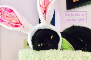 What's wrong with this picture? I'll tell ya'-- these goofy bunny ears, that's what. I don't look like a bunny, I don't feel like a bunny & I don't sound like a bunny--whatever that is. I'm just gonna' take a nap, a cat nap, a bunny nap--whatever. Wishin' you baskets brimmin' with Easter goodies, cavities & calories.