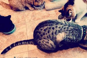 Mom, it's time for our mid-day dry food treat! We're waiting. Patiently waiting, I might add. The food cartons are right behind you in the laundry room. And our food bowls are right here -- just in case you didn't notice. We're starrrrr- ving. Know what I mean?