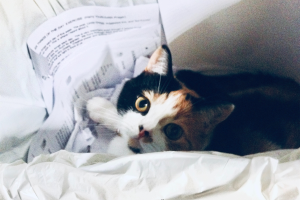 Bet you didn’t know I was here! I can tell by the look on your face. You’ve been throwin’ paper in here. You didn’t even know I was here until I shuffled the papers underneath me. Then you saw me. SURPRISE!! Got ya’! I love to surprise my hooman & my scaredy cat siblings. I have tons of hiding places. I jump out at ‘em &, before they can say meow, I’m flyin’ outa’ the room. Then the chase is on. I love to play!!