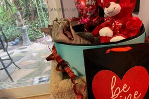 What’s up with all this red stuff, hearts, teddy bears, bah-loons? I’m sittin’ in front of a big heart at this very moment. Bigger than mine furr shure. Bigger than my hooman — I’m certain of that. We all have good hearts if you get my drift so we’ll all be your Valentine. Think of us & you’ll have a super Valentine’s Day!!