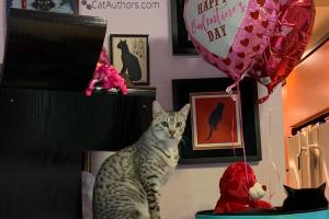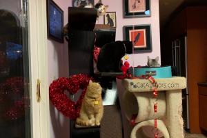 Our hooman’s taking a break from our photo shoot. Maybe she’s frustrated cause we keep moving, scattering. In this pic we’re lookin’ in different directions, we’re on different levels, we’ve been pouncing on the ribbons that dangle from those bah-loons that keep moving — scraping & bouncing on the ceiling & walls. You know we cats LOVE anything that moves. We’re having fun & hope you are too! Happy Valentine’s!!!