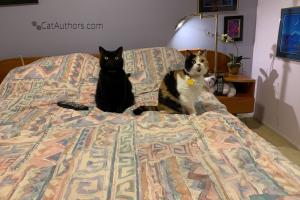 Our hooman's been sitting in front of that screen for a long, long time. It's very late. Maybe she's writing about us. We help her as much as we can -- including not stepping on the keys in front of the screen. She tells us: "Be careful, don't step on the keys." I never do but some of my sibs -- well, sigh. It's been dark out for a long time now. So, we're waiting for her to come to bed. We're telling her to hurry up! We need to get to sleep. Some of my sibs are already asleep.